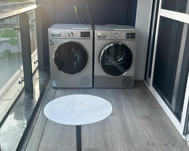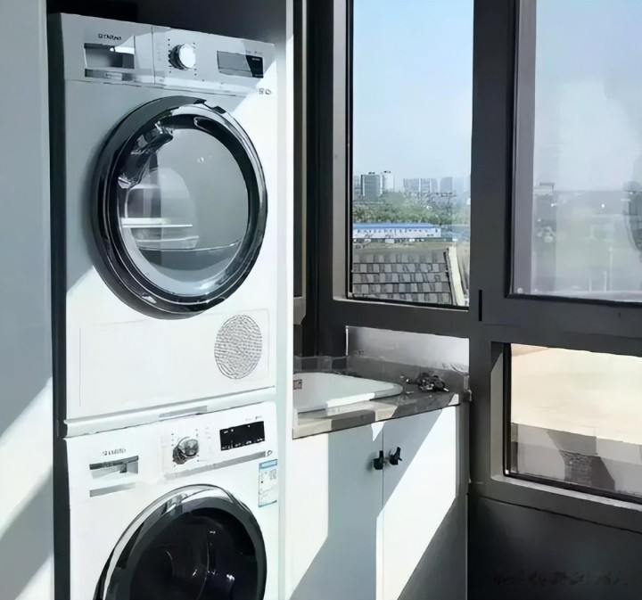 阳台是室内采光最强的功能区,如果你在这里放上洗衣机和烘干机,温度暴晒会影响洗衣机的使用寿命!