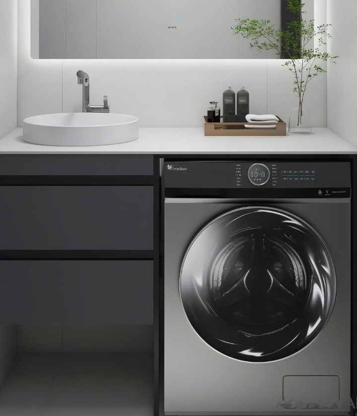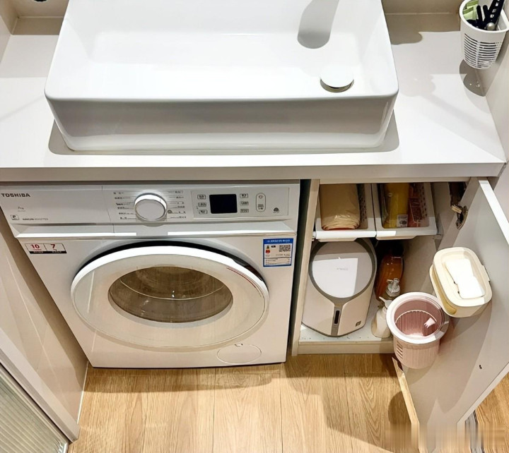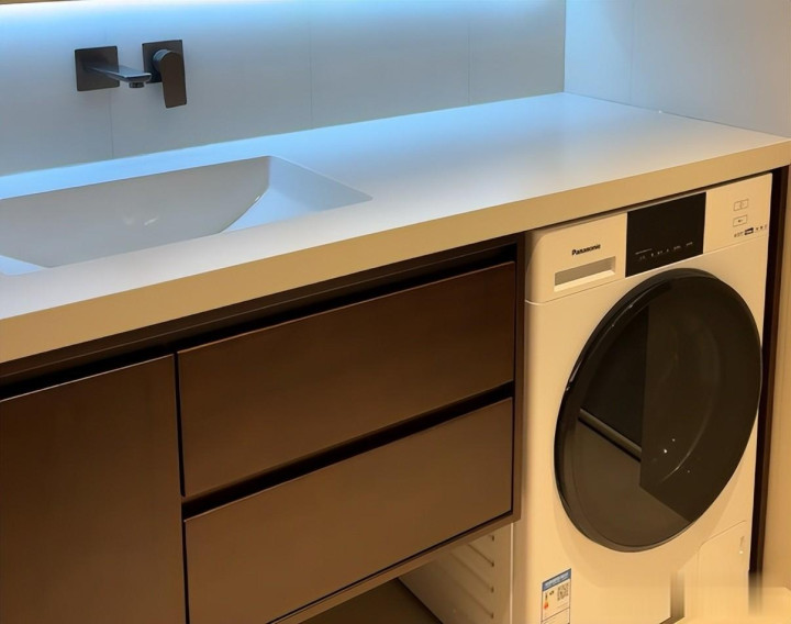 如果你家的空间允许,可以定制洗手台,把洗衣机嵌入到里面之后,上面的空间还能利用上。