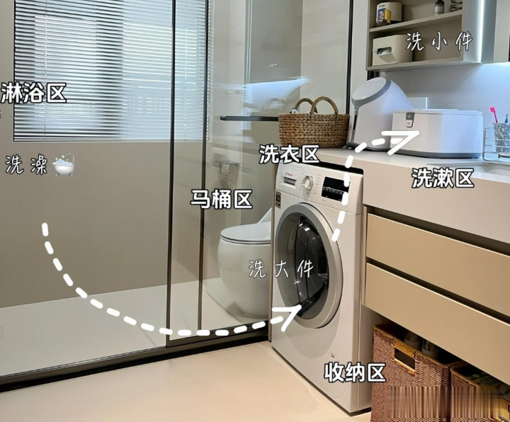 目前比较流行的设计是把动线设计在一起,马桶、洗手台都连接在一起,让室内很宽敞,洗衣服顺手多了。